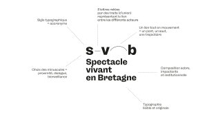 Le monogramme SVB, conçu comme un trait d’union, symbolise le lien entre les acteurs du spectacle vivant et les institutions. Sa forme en mouvement, intégrant un pont entre les lettres, évoque la trajectoire, le dialogue et l’évolution permanente du secteur. L’univers graphique, structuré par des effets de strates et d’étagement, fait écho aux gradins, aux parcours artistiques et à l’accompagnement proposé par SVB. L’identité visuelle trouve ainsi un équilibre entre rigueur institutionnelle et expressivité créative, fidèle à la mission de SVB.