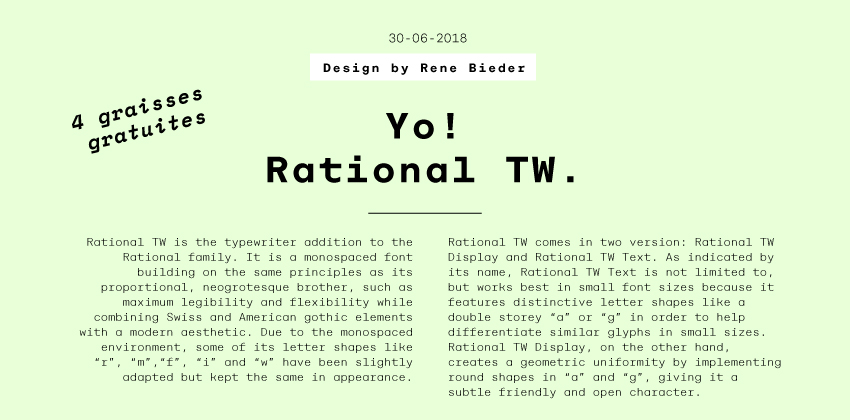 Petit rappel de ce qu’est un caractère monospace : par définition, le caractère monospace est un caractère à chasse fixe. Et la chasse, c’est quoi ? La chasse est la largeur de la lettre augmentée de ses approches. Très appréciés pour la programmation, les typos monospaces peuvent être également un véritable atout graphique dans les mises en page ou les identités.